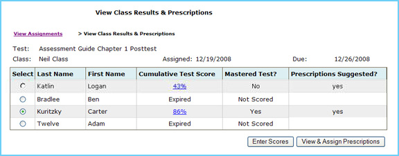 - Select one student by using the appropriate radio button in order to enter in a score or display prescriptions.